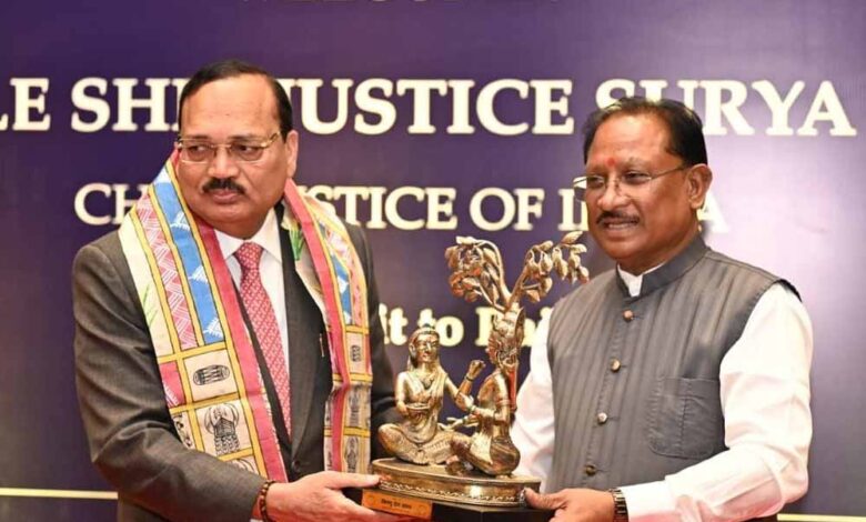 मुख्यमंत्री विष्णु देव साय ने भारत के माननीय मुख्य न्यायाधीश न्यायमूर्ति सूर्यकांत के छत्तीसगढ़ आगमन पर पुष्प गुच्छ भेंटकर उनका आत्मीय स्वागत एवं अभिनंदन किया। इस अवसर पर मुख्यमंत्री साय ने माननीय मुख्य न्यायाधीश को छत्तीसगढ़ की समृद्ध सांस्कृतिक परंपरा के प्रतीक स्वरूप राजकीय गमछा, विश्वविख्यात बस्तर दशहरा पर आधारित कॉफी टेबल बुक तथा बेल मेटल से निर्मित भगवान श्रीराम एवं माता शबरी की आकर्षक प्रतिकृति भेंट की।